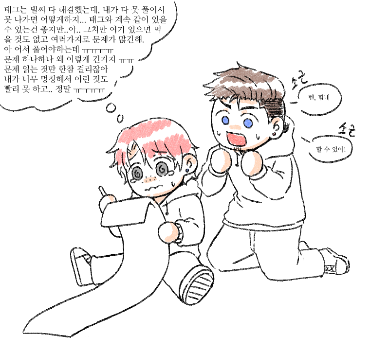 앤오님이 레몬 먹구 짜부 얼굴 되는 귀여운 태그를 그려주셔서ㅋㅋㅋㅋ 이어 그렸던 거네요. 중간에 너무 날려서 벤 옷이 사라지지만...